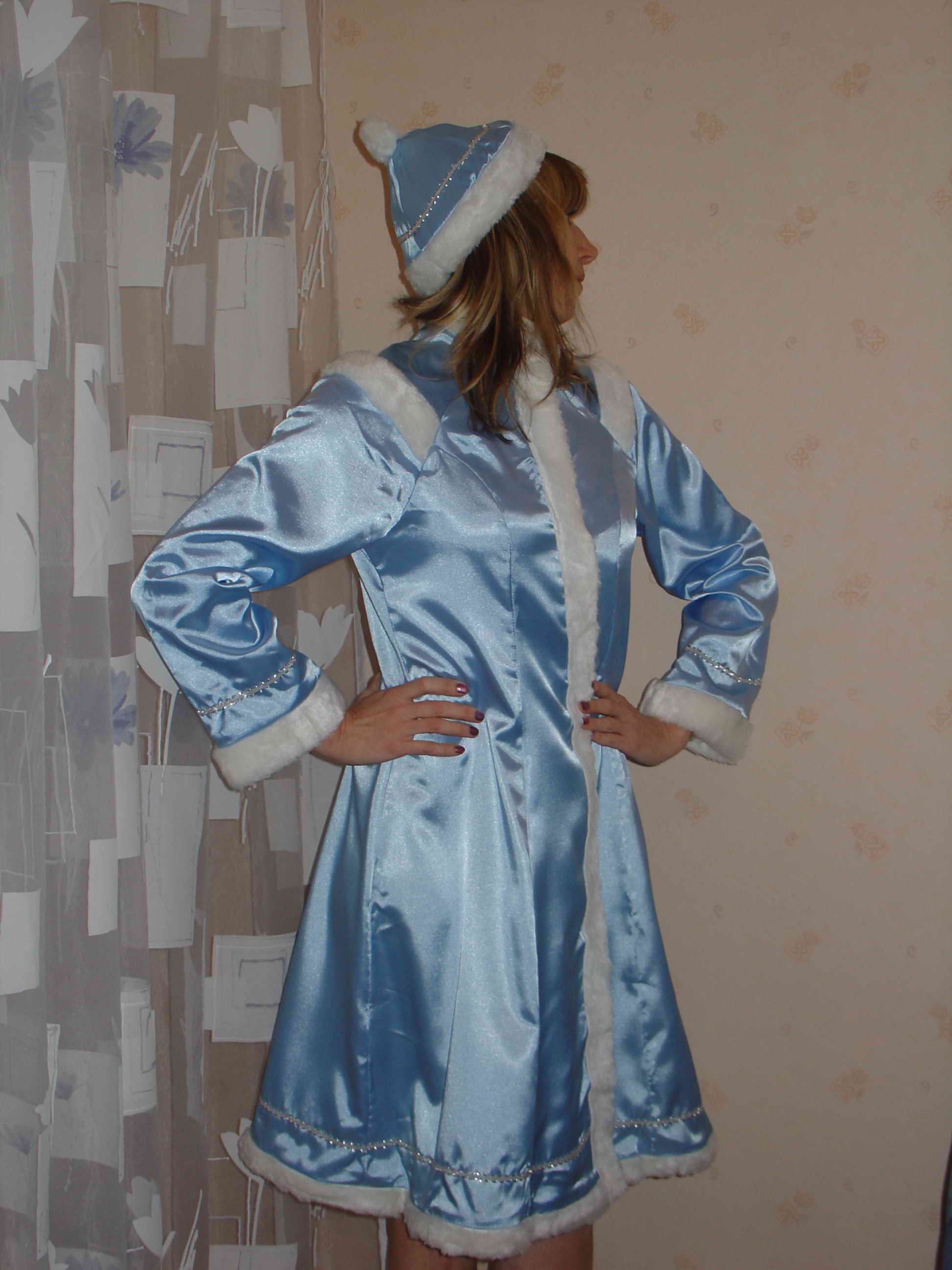 В комплект костюма Снегурочки: халат, шапочка.