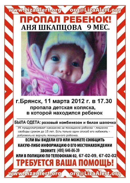 БРЯНСК, 18 мар — РИА Новости. Уже целую неделю Брянск всем городом ищет пропавшую 11 марта девятимесячную Аню Шкапцову. Полиция и добровольцы сбились с ног. Казалось бы, каждый житель города знает приметы потерявшегося ребенка: белая шапочка, розовый комбинезон, зеленый плед. Семь суток поисков не дали никаких результатов: ребенок до сих пор не найден.